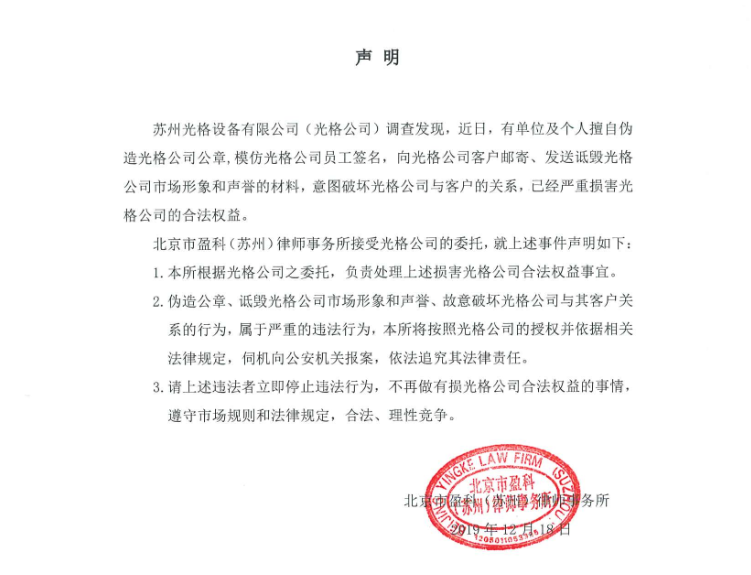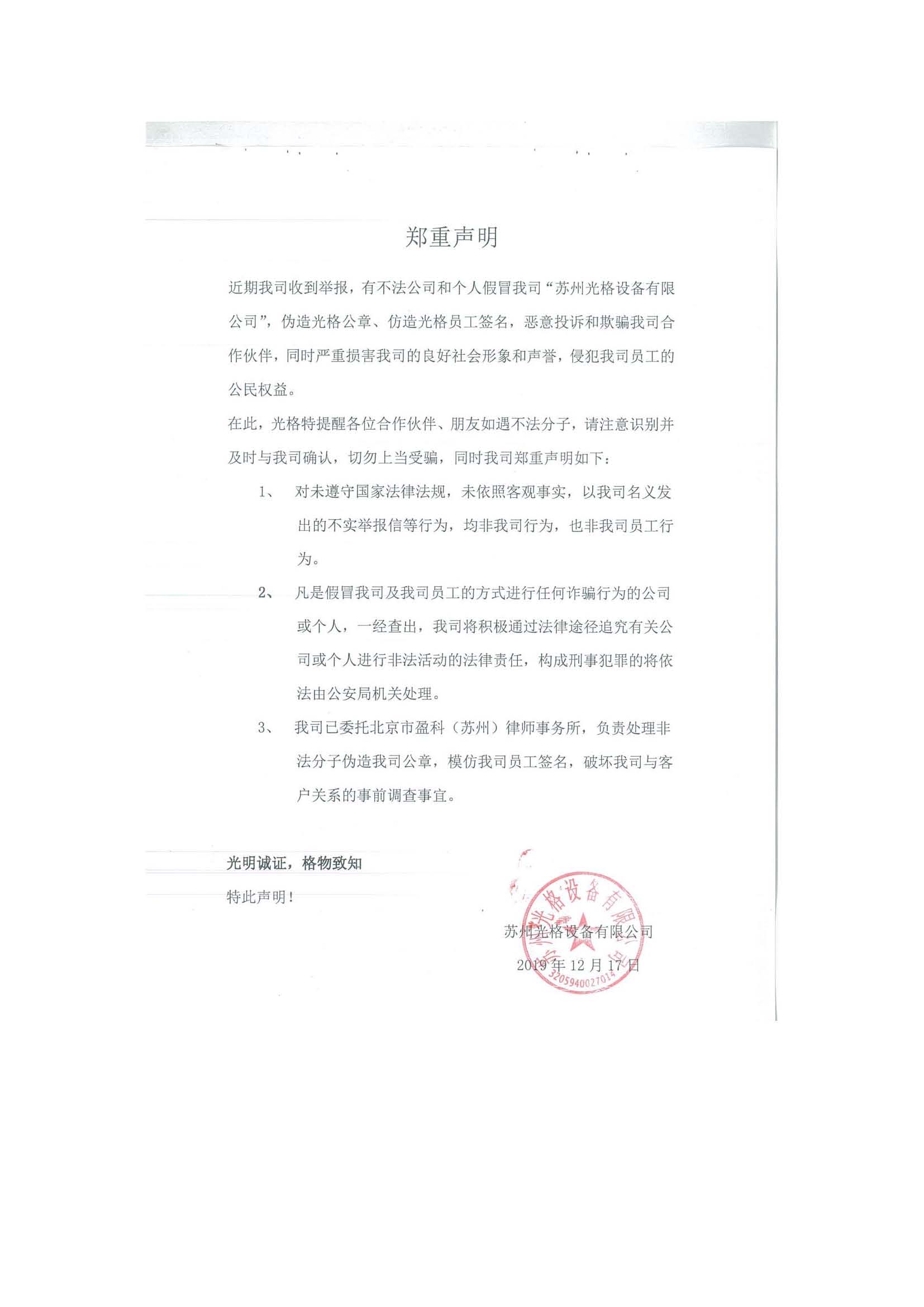 近期我司收到舉報(bào),有不法公司和個(gè)人假冒我公司“蘇州光格設(shè)備有限公司”名義,偽造光格公章,仿造光格員工簽名,惡意投訴和欺騙我司合作伙伴,同時(shí)嚴(yán)重?fù)p害我司的良好社會(huì)形象和聲譽(yù),侵犯我司員工的公民權(quán)益。