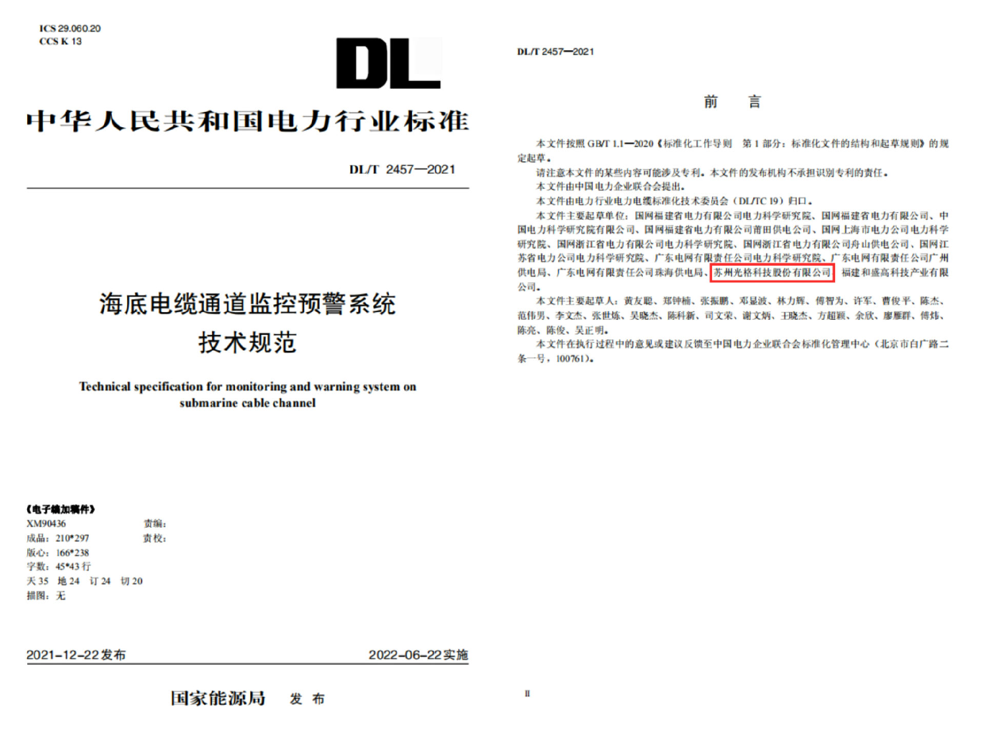 光格科技堅持自主研發(fā)、持續(xù)創(chuàng)新的理念,積極推進行業(yè)技術(shù)的發(fā)展趨勢,重點參與制定國家能源發(fā)布的《DL/T 2457-2021 海底電纜通道監(jiān)控預(yù)警系統(tǒng)技術(shù)規(guī)范》行業(yè)標(biāo)準(zhǔn),持續(xù)為海上風(fēng)電安全事業(yè)貢獻前沿科技,為祖國建設(shè)成為海洋強國和能源強國貢獻一份力量。