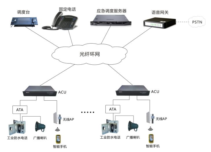 應急通信系統主要由應急調度臺、區域控制單元、電話終端、語音網關等組成。系統通過以太網絡實現現場各電話終端之間、電話終端與控制中心的相互呼叫以及應急調度、應急廣播,通過無線信號覆蓋和WIFI手機實現無線語音通話及人員定位,通過語音網關實現與公網之間的通信,提高了處置突發事件的能力。