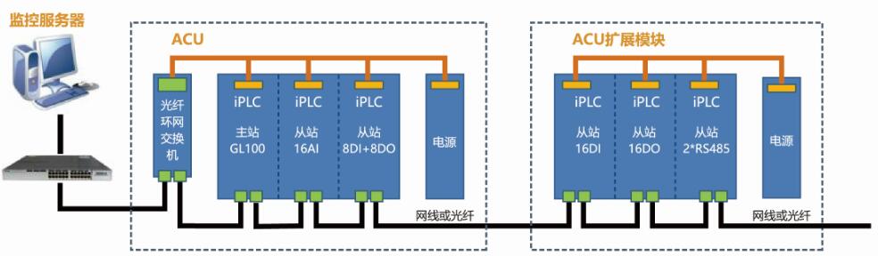 ACU(區域控制單元,Area Control Unit),負責工業現場特定區域的信號采集、控制輸出和遠程通信及本地告警顯示等任務,一般由可編程邏輯控制器(PLC)、工業交換機、電源、保護模塊和防護機柜等部分組成。