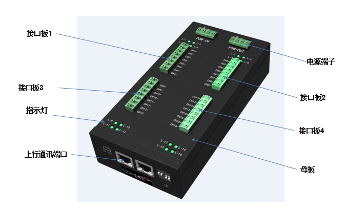 2、從站母板母板主要由ARM處理器、EtherCAT通訊接口、接口擴(kuò)展槽、狀態(tài)指示燈等部分組成,每個(gè)母板包含3個(gè)或4個(gè)接口擴(kuò)展槽,每個(gè)接口擴(kuò)展槽可自由選配任意類型的接口板。