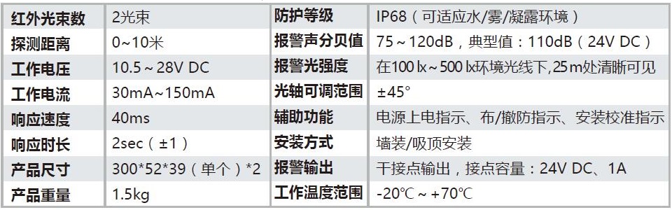 功能。紅外入侵報警器由主機和從機配對組成,構成一發一收的模式,工業級芯片保證產品可靠穩定,IP68防護等級為隧道/管廊高潮濕應用環境提供完美解決方案。