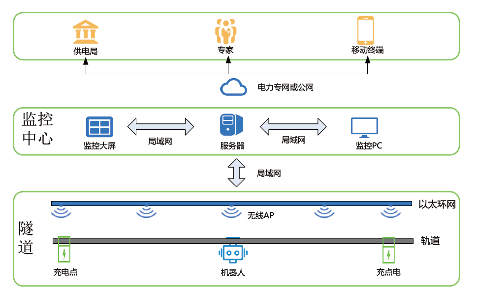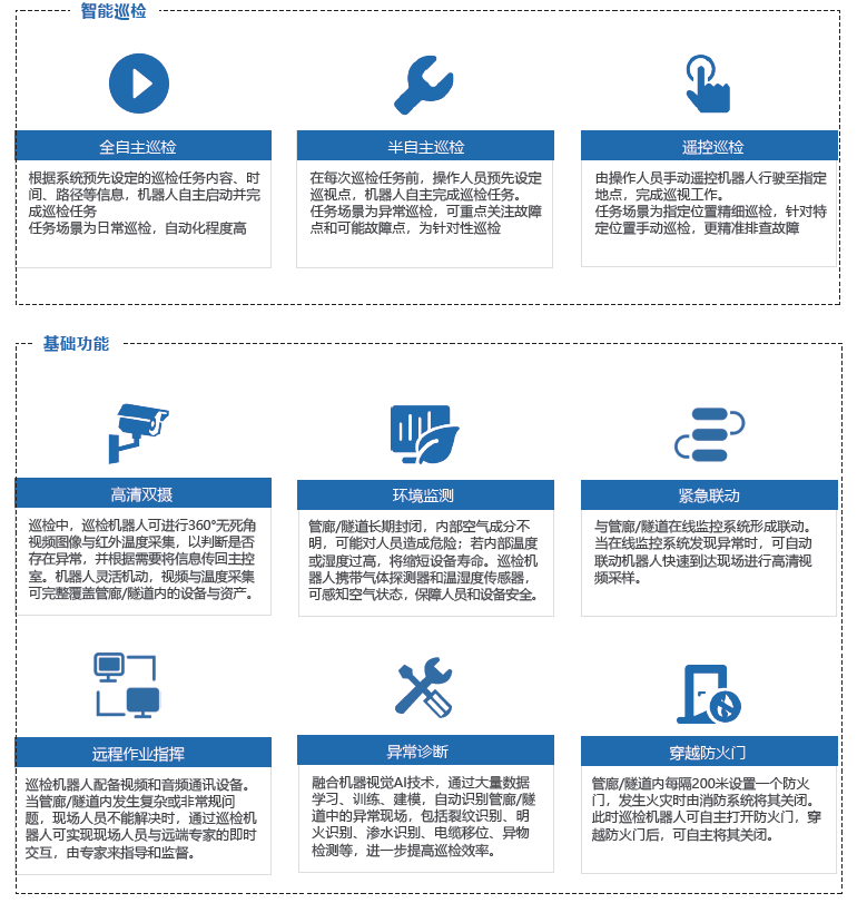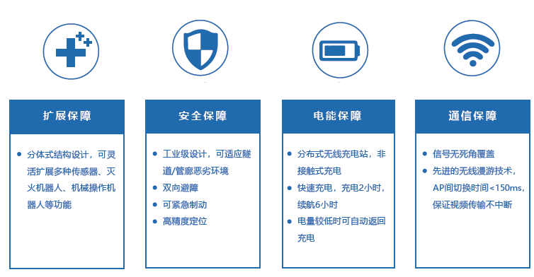 巡檢機器人的可移動性使其能夠對電纜隧道監控實現空間無死角監控,緊急情況時可以及時趕到第一事故現場,把現場的視頻、圖像、有害氣體含量等信息及時送回指揮中心;同時也可以執行應急對講指揮等相關的處置措施,起到更好的防災減災的效果。
