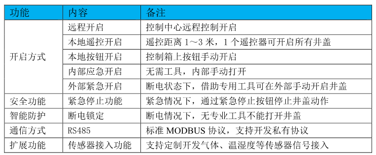 AMC1000系列智能電動井蓋是專為綜合管廊/電纜隧道量身打造的全自動智能井蓋,智能電動井蓋由井蓋本體結構系統、動力系統、控制系統、監測系統組成,可以在控制中心實現對井蓋的遠程控制,同時具有現場遙控開啟、本地按鈕開啟、手動應急開啟等功能。智能電動井蓋主要用于綜合管廊/電纜隧道人員出入口、逃生口、檢查口等,對進入人員進行管控,保證管廊/隧道內部設備的安全;在斷電情況或者緊急情況下,作業人員在外部借助專業工具可手動打開井蓋,在內部能夠手動開啟,可快速、安全離開,保證人員安全;智能電動井蓋尺寸和功能可根據客戶需求量身定制。