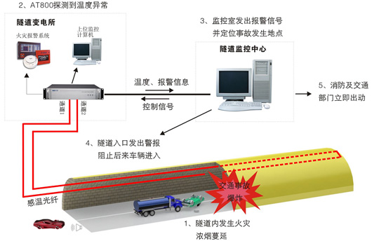 分布式光纖隧道火災監測系統采用感溫光纖作為探測器,使用多通道、高速、集中光電測溫主機進行信息采集與處理,能實時監測整個隧道內的溫度變化及火焰蔓延方向,對隧道內的火災情況進行全面監測。上位監控計算機位于控制中心,控制室外的現場只布設感溫光纜,大大提高了系統可靠性,全套系統能夠很好滿足隧道火災進行在線溫度監測的要求,是現代消防報警的理想高科技產品。