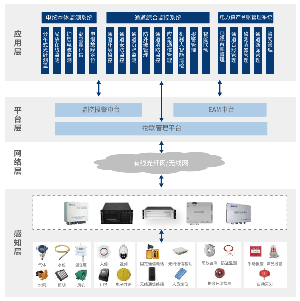 電纜本體狀態監測子系統:實現對電力隧道內高壓電纜、局部放電、護套環流、故障定位的實時監測,并進行載流量評估,保障電纜安全運行,實現動態增容。